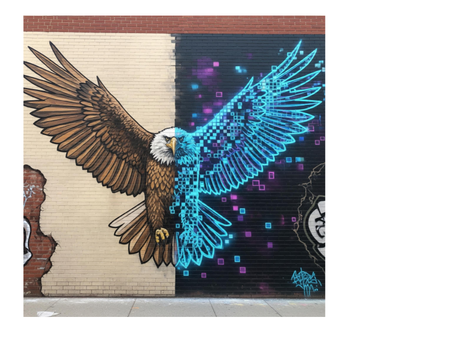 AI Image Prompt: A mural that looks half-digital and half-hand-painted, with visible brush strokes blending into glowing pixels.
