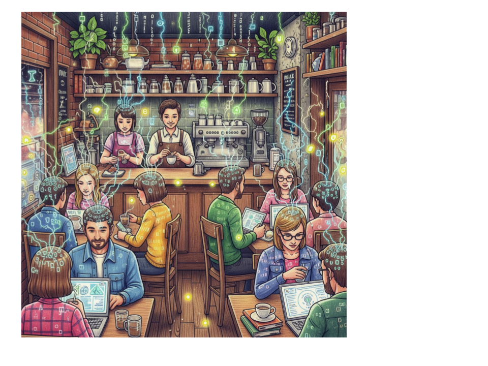 AI Image Prompt Suggestion: “Digital painting of a small café filled with glowing lines of text floating around like fireflies, symbolizing AI-generated ideas.”