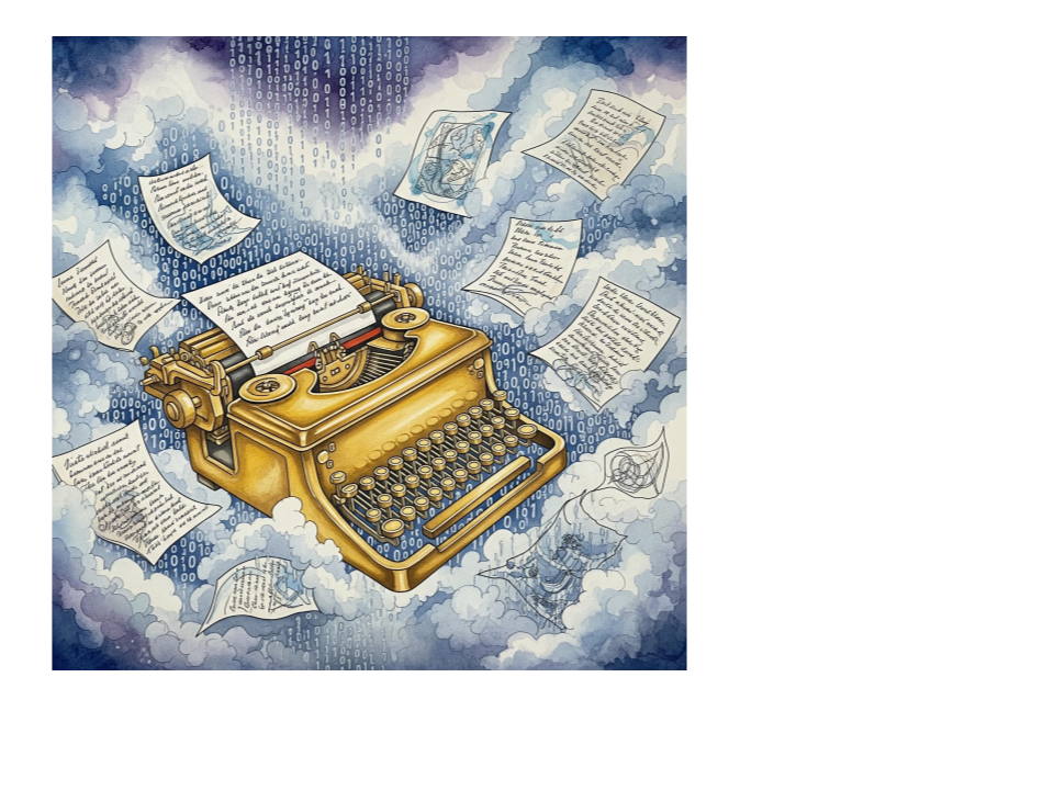 🖼️ AI Image Prompt: A golden typewriter floating in a dreamlike cloud of binary code and poetry pages.