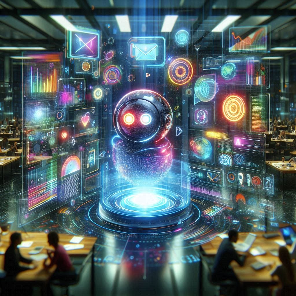 Here's a prompt you can use to generate an image with AI art tools: "A futuristic desk with holographic screens displaying newsletter content, with a robotic arm assisting a human writer."