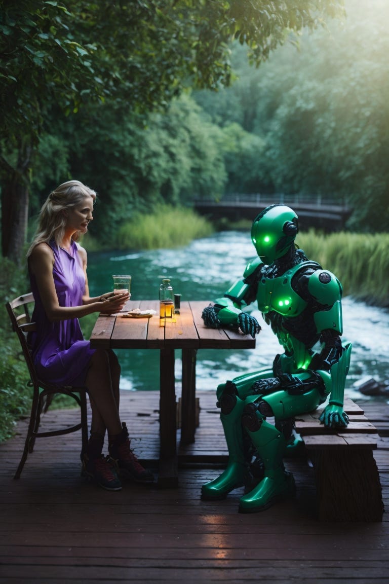 Prompt: /imagine prompt: Huckleberry the Chatbot and Emily set at a table, A sun-kissed, meandering riverside path, embraced by lush, emerald foliage. Huckleberry, with LED eyes gleaming, stands beside Emily, their faces alive with wonder and camaraderie. Rustic café tables dot the scene, inviting connection. Nature's hues blend with futuristic sheen, embodying their unique bond.-ar 16:9