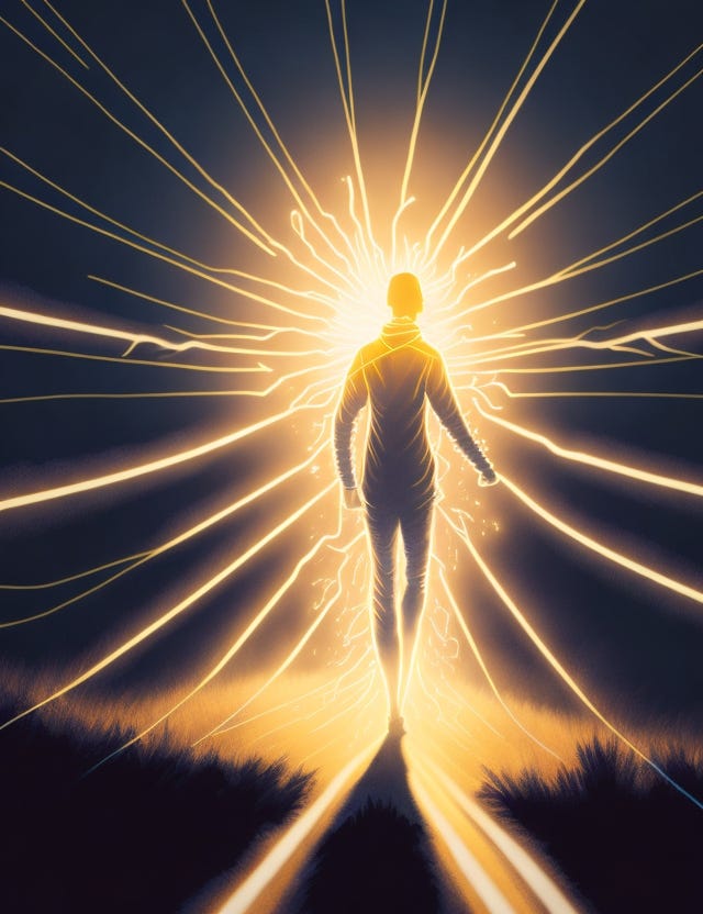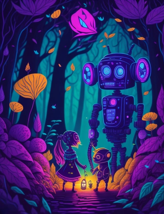 Prompt: dazzling, whimsical world unfolds—Emily and Huckleberry the Adventurous Chatbot, hand in circuit, stand at the crossroads of technology and nature. The digital enchanted forest, ablaze with neon magic, pulses with harmonious energy. AI fairies flit in the virtual breeze as pixelated flora blooms in vibrant hues. A symphony of code and imagination resonates, encapsulating the essence of their extraordinary journey.